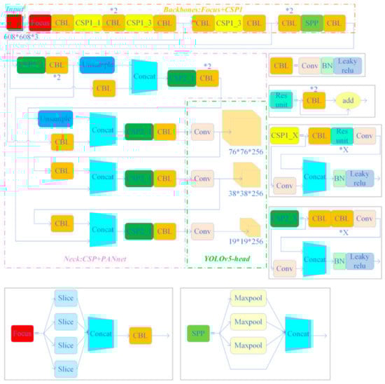 In the context of engineering bolt identification and loosening detection, having a highly accurate and efficient identification model is crucial. Therefore, this paper adopted a deep learning model based on the YOLO series of algorithms to implement the proposed bolt target detection framework. Three good-performance algorithms used in other fields, namely, YOLOv4, YOLOv5, and YOLOX, were also compared. The three deep learning models of the YOLO series chosen for comparing recognition accuracy in this paper were all submitted after improving the YOLOv3 [] -based deep learning model [,]. Since the three deep learning models were similar in structure, a brief description of the network structure of YOLOv4 and the main differences between the three models are shown below. In addition, the network structures of these three models are shown in Figure 3, Figure 4, and Figure 5, respectively.