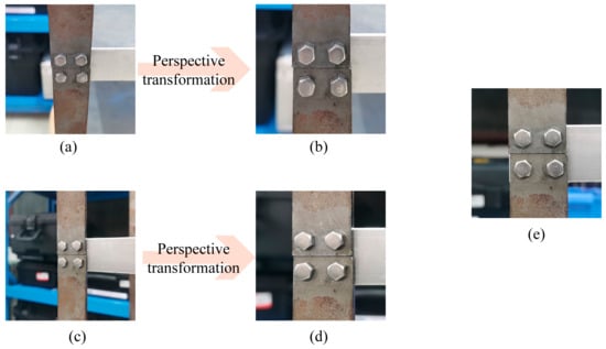 where u, v represent the coordinates of the original image, and x, y represent the coordinates of the image after the perspective transformation. Prior knowledge of the coordinates of the four points of the image to be transformed and the corresponding coordinates of the four vertices of the transformed image rectangle were necessary for the successful implementation of the algorithm. This study developed an application that allowed the user to obtain the four points of the image to be transformed by clicking on the four vertices in the image, while the four vertices of the transformed image rectangle could be predetermined based on the real dimensions of the bolted constructions. The effectiveness of the perspective transformation was illustrated with an example of a 30° tilt in the horizontal and vertical directions, as shown in Figure 6.