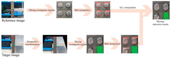 Figure 8 illustrates the proposed framework for missing bolt detection, which followed the procedure described in Section 4. The reference image was first segmented into rectangular regions containing bolts, which were used to compute their relative center coordinates. Next, a deep learning neural network detected the bolts and extracted their target recognition boxes from the reference image, which were stored in the system. To detect a missing bolt in a test image, the test image underwent perspective transformation and rectangle segmentation. The same neural network detected and outputted the target recognition boxes of the bolts in the test image. Finally, by applying the IoU calculation method presented in Section 4, any missing bolts could be identified. The developed system was highly automated and only required users to click on the four corners of each rectangular region containing bolts in both the reference and test images.