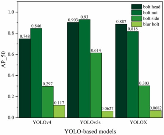 The recognition results of different networks for different bolt image classes are shown in Figure 10, which shows the average precision results of the three YOLO algorithms for all labels. It is worth noting that the category “blur bolt” included both blur nuts, blur bolt sides, and heads, with “blur” being a relatively subjective concept. Therefore, when the model accuracy was high, the model would likely identify the actual category of these vague bolts rather than the “blur bolts”. This phenomenon led to lower recall of “blur bolts” and hence a lower average accuracy for the “blur bolts” category.
