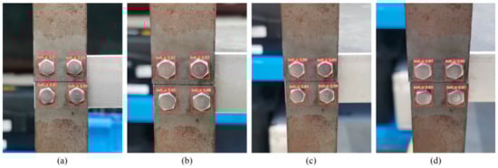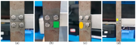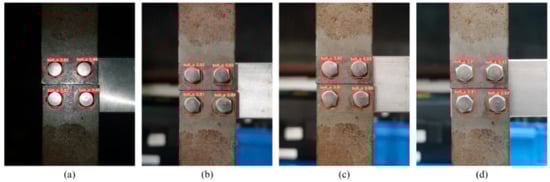 In the past two decades, computer vision (CV) technology has emerged as a low-cost and efficient method to detect structural deformation [,] and damages [,]. Recently, CV technology has also been introduced for the aim of bolt loosening detection. Zhang et al. [] proposed a novel structured light method based on motion image (SLMMI) for moving object inspection, which has been successfully used to inspect loose fasteners on high-speed railways. Zhou et al. [] proposed an automated vision method for scanning angle taps to detect missing bolts during loading operations. Dou et al. [] developed a Fast Template Matching (FTM) algorithm to identify the presence or absence of bolts. Similarly, Manikandan et al. [] proposed a machine vision-based fully automatic detection and classification of a missing bolt detection system using a Support Vector Machine (SVM) classifier. These studies demonstrate the potential of computer vision in bolt loosening detection. In contrast to other bolt loosening detection methods, such as vibration or wave-based methods, the visual inspection is less susceptible to environmental factors such as temperature, humidity, and noise []. Furthermore, it can be utilized in complex engineering scenarios and has the capability to detect multiple loosened bolts simultaneously.