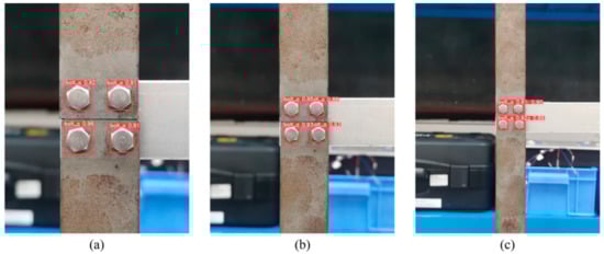 The shooting distance was also a crucial factor. Therefore, this study used images taken at three different distances for validation. These were 15 cm for close range, 25 cm for medium distance, and 40 cm for far distance. As seen in Figure 14, the model accurately identified the bolts at all three different distances, and the confidence level fluctuated in almost the same range, which meant that the detection accuracy was not affected by the shooting distance of at least 40 cm.