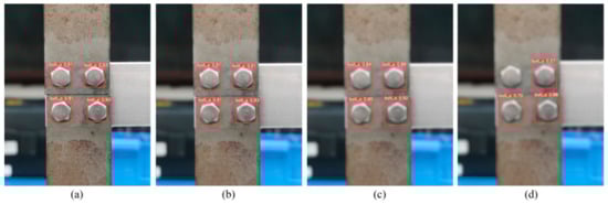 The robustness of the YOLOv5s model at different perspective angles was evaluated by taking sample images at horizontal angles (0°, 10°, 20°, 30°) and vertical angles (0°, 10°, 20°, 30°), as shown in Figure 12 and Figure 13. Bolts were accurately identified by the model at 30° or lower angles. However, the confidence level in identifying the target frame decreased as the perspective angle increased, indicating a lower accuracy. Furthermore, the confidence level for recognition at certain horizontal perspective angles was above 85%, but it was only above 80% at the same vertical perspective angles. Thus, the recognition accuracy of the model was more significantly decreased by increasing the vertical angle than by increasing the horizontal angle. Therefore, images at large perspective angles, especially vertical ones, should be avoided.