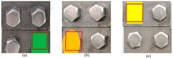 The proposed method was tested on target images with different shooting angles and distances while keeping the reference image to assess its practicality in real-world applications. Different shooting angles tested the impact of perspective transformation on missing bolt detection, and different distances tested the effect of relative center coordinates. The reference image and part of the target image, colored to simulate a bolt defect, are shown in Figure 17. The model identified the cropped rectangular image directly after the perspective transformation to eliminate the influence of bolt coordinates on the missing detection results since relative center coordinates depended on a rectangle or four vertices forming a rectangle in the image. Figure 18 shows the results, indicating that the perspective angle was accurate for missing detection up to 30°. Moreover, the bolt coordinates did not affect the missing detection outcomes.
