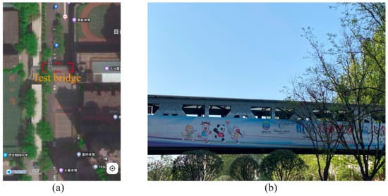 Pedestrian bridge for testing. (a) Bridge location (from Amap), (b) Real view of the bridge.