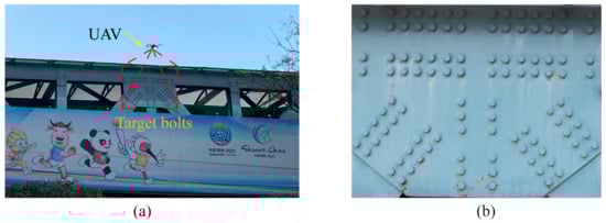 Image capture of bolted joints by UAV. (a) UAV approaching bolted connection and (b) target bolts.