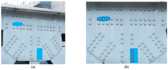 The DJI Air2S drone was employed to obtain images of the bolt connections at a high resolution of 5464 × 3640 pixels, and its specifications are listed in Table 1. To capture the images, the drone was gradually steered toward the bolt connection under scrutiny, until it was situated approximately 1 m in front of it, as shown in Figure 20a. A cropped image of the target bolt was then taken with minimal perspective distortion (i.e., perspective angle ≤ 5°), which served as the reference image for the subsequent bolt defect detection. Furthermore, since the images were taken on a clear day, the shadows on the bridge were more prominent and provided a means of testing the model’s ability to identify defects under different lighting conditions. The cropped image of the target bolt is depicted in Figure 20b.