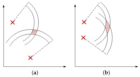 The WGDOP metric is explained in [20]. WGDOP involves an inverse visibility matrix (defined in Section 2.2) relating the covariance of range errors to that of a position solution. Furthermore, a conceptual representation of the concept behind WGDOP is shown in Figure 1, where two anchor nodes are used to solve for a two-dimensional position in the plane, using range measurements with lateration. In the presence of noisy ranges, the uncertainty is visualized as two concentric circles, with the true range lying in between. The intersection of the two circles, in the noisy case, provides an area in which the receiver is estimated to be. When comparing Figure 1a,b, it becomes clear that the geometrical situation of the anchor nodes affects the size of this area, which is indeed quantified by the WGDOP.
