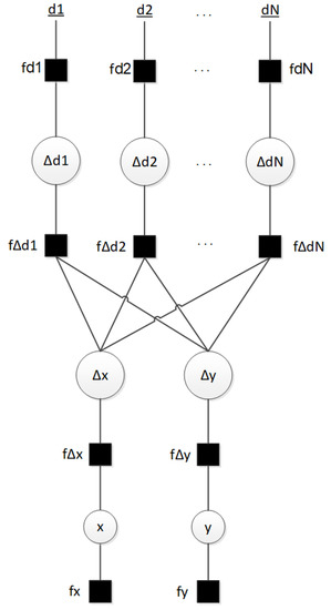 The variables of the previous linearized ranging and positioning algorithms (Section 2) were used and related through the Bayesian network (BN) of Equation (6). A BN is a probabilistic graphical model that represents a set of variables and their conditional dependencies via a directed acyclic graph. Therefore, the probability of the position of the target given the distance measurements is the following BN: