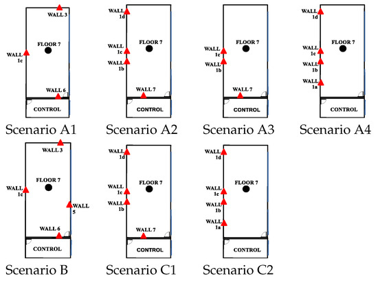 • Scenario C1: This was an intermediate scenario with four anchor nodes in softNLOS with intermediate geometry. Scenario C1 is shown in Figure 6, whereas the estimated WGDOP and RMSE are shown in Figure 22 and Figure 23, respectively. The WGDOP value of group 2 (WALL1c,1d,7) was the lowest at iteration 10. Note that for WALL7 the value (m) was higher than for the other anchor nodes but its position improved the geometry issues with the WGDOP value. In softNLOS conditions, the error was increased in the error distribution, but following Gaussian issues without high bias. Therefore, the results of the algorithms with FG were similar to the results of algorithms LS and WLS. Moreover, the RMSE value of the algorithm with FG and WLS was m (iteration 4) and the RMSE value with DW system was m, proving similar.