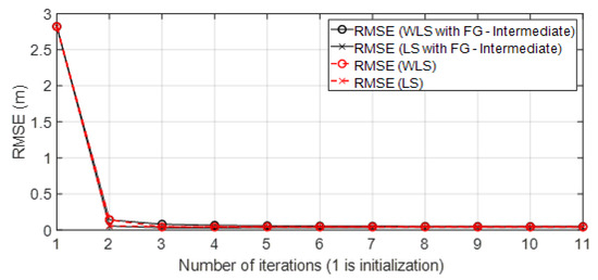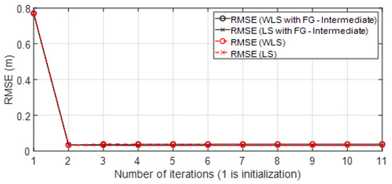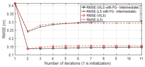 In the next Section 4, the results are shown. In the figures, the results obtained are compared to the four solutions: (Sol.A) iterative FG algorithm to avoid loops (Algorithm 1) with the WLS algorithm to solve messages for each group (Section 3.3). This solution is named in Figures as “WLS with FG-Intermediate”; (Sol.B) iterative FG algorithm avoiding loops (Algorithm 1) with the LS algorithm to solve messages for each group (Section 3.3). This solution is named in Figures as “LS with FG-Intermediate”; (Sol.C) iterative classical LS and WLS algorithms (Section 2.3); and (Sol.D) positioning data collected from UWB commercial nodes and stored in published datasets [23]. In the case of the iterative approaches (Sol.A), (Sol.B), and (Sol.C), the initialization and updating of variables (related to the scenario and variables of the Taylor series algorithm in each iteration) follows the same procedure as was explained in Algorithm 1. However, for (Sol.C), the variable obtained in each iteration is used to update the Taylor algorithm for initialization. Note that in this case, is the result with classical approaches, so it is not the marginal function. Moreover, the classical algorithms cannot estimate the covariance of the position in its equations of positioning as the FG does.