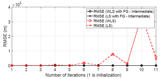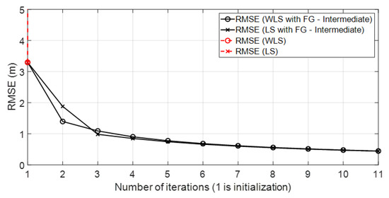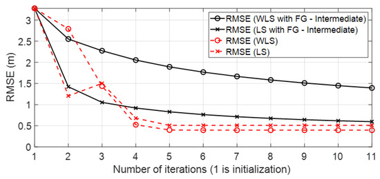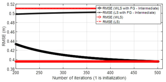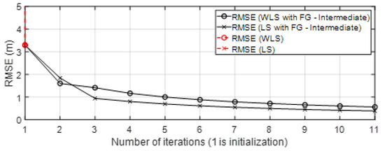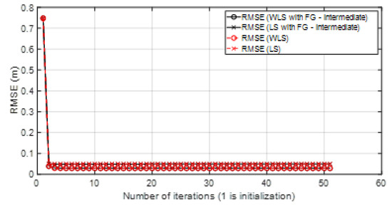 Figure 4 shows the geometrical effect on the positioning error in a good scenario, with good propagation conditions, and with simulated results. It can be observed that the geometrical effect that increased RMSE values in some parts of the scenario could be corrected by the FG-based algorithm.