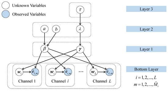 To summarize, a four-layer hierarchical Bayesian model is built in this subsection, as shown in Figure 2. The observed vector and the sparse vector constitute the bottom layer of the model. The introduction of the hyperparameters extends the model to higher stages, and the prior distributions act as links between layers. Combining the layers of the Bayesian model, the joint probability distribution can be obtained as follows (parameters , , and are omitted for clarity in this paper)