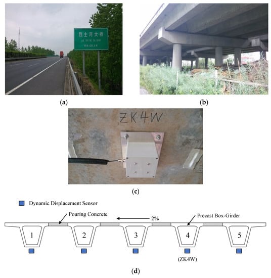 Lieshihe Highway Bridge: (a,b) the actual view; (c) site installation of sensor ZK4W; (d) sensor placement on the box girder.