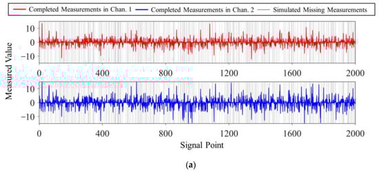 Received measurement vectors under different data loss patterns in Case 1: (a) uniform random loss, Channel 1 and 2 with ; (b) non-uniform random loss, Channel 1 with and Channel 2 with .