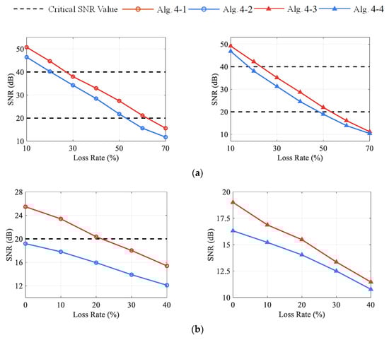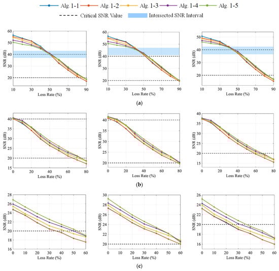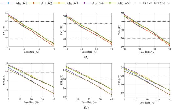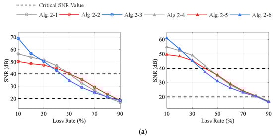 In addition, when comparing the SNR-LR curves from different channels at the same CR in Figure 7, it can be discovered that the curves of each algorithm follow the same trend, which again validates the performance variation among Algorithm 1-1 to Algorithm 1-5. Compared with channel 3, signals from channels 1 and 2 usually have higher SNR values under the same CR, LR, and algorithm choice. Therefore, signals from different channels can adjust the compression strategies according to their own characteristics to achieve high-quality wireless transmission.