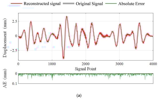 Based on the above phenomena, the distortion of the recovered signal can be classified into three levels according to the SNR value, which are mild distortion (), moderate distortion (), and severe distortion (). The critical values are marked with black dashed lines in Figure 7. Signals with mild distortion are very close to the original signals, which can meet the requirement of high-precision recovery. The moderately distorted signal has a high practical value as the accuracy can satisfy most engineering applications while providing enough redundancy for data compression and transmission loss. The SNR value of the reconstructed signal should be at least higher than 20; otherwise, it will be diagnosed as an unusable signal with severe distortion. Under this criterion, the proposed DSC-Laplace is an adaptive algorithm. By adjusting the penalty factor , DSC-Laplace can adapt to vibration signals with different sparsity to optimize performance. In Case 1, algorithm 1. is suggested if a high-accurate signal is required; algorithm 5. is suggested to obtain a signal with moderate distortion if striking the balance between transmission energy consumption, missing data allowance, and reconstruction quality. The reconstructed dynamic displacement of channel 1 with absolute errors (AE) when the SNRs are close to 40 and 20 is shown in Figure 8, respectively. According to the definition of SNR in (37), the decrease in the SNR indicates the accuracy decline of the reconstructed signal. Therefore, the AE of the reconstructed signal when the SNR is close to 20 is much higher than when the SNR is close to 40.