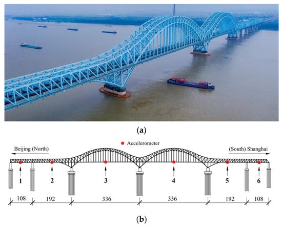 Lieshihe highway bridge, shown in Figure 4a,b, is a representative continuous beam bridge on the Jiangsu Coastal Expressway in China. It is composed of two symmetrical lanes, left and right, with opposite traveling directions. The superstructure of each lane is composed of several m prestressed concrete box girders bounded by expansion joints. An SHM system was installed to monitor the daily operation of the bridge in real time. As the typical vibration signal induced by traffic loads, the dynamic displacement data are used to simulate the wireless transmission in this study. The measuring positions are in the midspan of the girder with five sensors assigned to each lane. Taking the left lane as an example, the site installation of the sensor is shown in Figure 4c. Each sensor is deployed laterally at the bottom flange centerline of box girders 1–5, respectively, as presented in Figure 4d. The sampling frequency of the signal is 50 Hz.