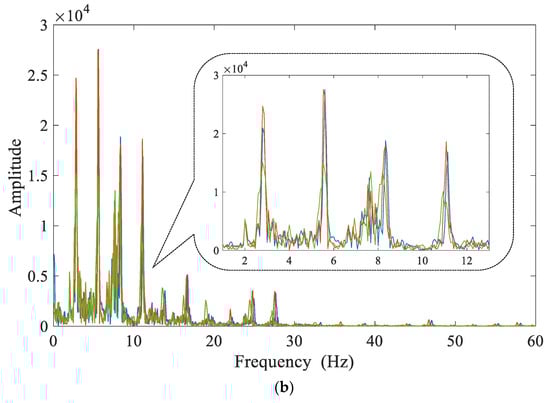 In this case, only signals from the left lane are used to simplify the research. Figure 5 shows an intercepted multi-channel signal at the same period in both the time and frequency domains. From Figure 5a, it can be observed that vibrations caused by passing vehicles will lead to the reciprocal displacement of the box girder, and the displacement will close to 0 when there are no vehicles. Figure 5b reveals that the Fourier amplitude of the signal from each channel, which is approximately sparsely distributed in the frequency domain, is mostly concentrated in the frequency interval of 0–0.5 Hz and 2–4 Hz with the negligible magnitude of the rest range. Meanwhile, the trend of the amplitude-frequency curves is quite close, indicating that the dynamic displacement data are strongly correlated in the frequency domain. The correlation matrix shown in Table 1 again confirms this fact. Therefore, the vehicle-induced dynamic displacement of the bridge girder is sufficiently sparse and intercorrelated, which meets the theoretical prerequisites of DCS. The vehicle-induced displacement in Figure 5a (10–90 s, 4000 data points in total) is finally selected as a case study of the DCS-Laplace algorithm for multi-channel signal transmission.