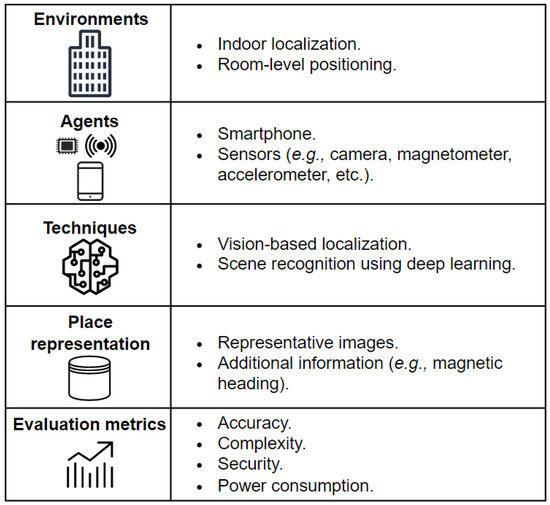 Indoor scene recognition is a key point in vision-based indoor localization, namely visual place recognition (VPR). Over the last two decades, image feature detection has been driven by local low-level feature extraction approaches, such as scale-invariant feature transform (SIFT) [28] and speeded-up robust features (SURF) [29], especially in scene recognition [30]. To improve the performance of scene classification systems, researchers have been interested in replacing these traditional feature detection methods with deep neural networks such as CNNs. CNN-based approaches predict the probability of scene categories directly from the entire scene image. VPR systems, which are capable of recognizing one’s location based on an observation, are characterized by several elements [31], as shown in Figure 2.