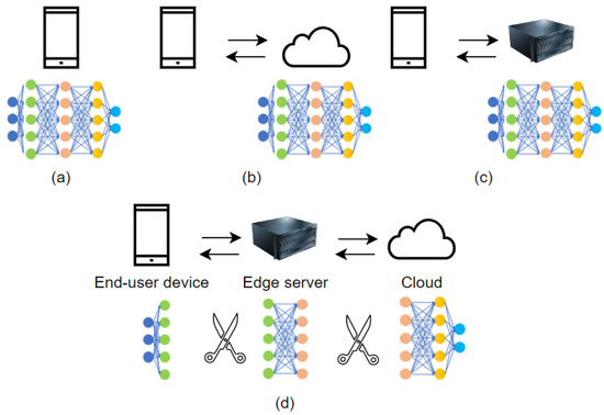Recent studies [44,45] have shown that splitting the network between the mobile device and cloud and/or edge servers can improve the end-to-end latency of CNN inference. One way of using hybrid computing with partial offloading with DL models is CNN model partitioning [46,47]. In such approaches, instead of creating an application handling everything, CNN architectures are distributed between the mobile device and cloud and/or edge server, as shown in Figure 3d. Thus, some layers are computed on the mobile device while other layers are computed by the cloud and/or the edge server, which may reduce the computation power required on the smartphone. The key aspect when distributing computing between the mobile device and the cloud and/or edge server is which data must be stored and processed locally. The optimal computation partitions for offloading are difficult to detect, requiring a separate study and analysis.