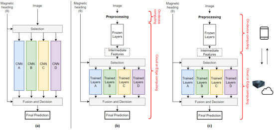 As explained in Section 4.1, DL model partitioning is the process of dividing a DL model into multiple parts that can each be deployed and run on different computing devices and servers. In the proposed indoor scene recognition system, several CNN models need to be saved and used during inference, requiring an increase in memory capacity and computation power. Including all the needed models in the mobile application bundle also significantly increases its download size, up to many megabytes (MB) in practice. The direction-driven CNNs of our proposed model have a common inference part because some of the layers of the CNNs are frozen during the training phase. Unlike trained layers, which are trained and validated on specific subsets of data based on the magnetic headings of the collected images, this part should only be computed once, helping to reduce the inference time and the size of the global DL model (composed of multiple direction-driven CNNs). Thus, the architecture of the proposed system represented in Figure 4a is partitioned into five submodels: the common submodel (i.e., frozen layers) and the other four submodels (i.e., trained layers A, B, C, and D).