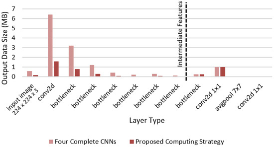 Additionally, Figure 7 describes the per-layer output data size (in MB) for the four complete CNNs represented in Figure 4a compared to the proposed computing strategies as in Figure 4b,c. We can observe the following. First, adopting the proposed computing strategy is better than using the four complete CNNs because the common frozen layers are implemented once rather than four times, resulting in less computation time and required power. Second, because the input image size is larger than the intermediate feature size, splitting the CNN into two parts (i.e., a first part running on the mobile device and a second part running on a cloud or edge server) may be more beneficial. As a result, the submodels are deployed in the manner described in Table 5 (i.e., partial offloading as in Figure 4c).