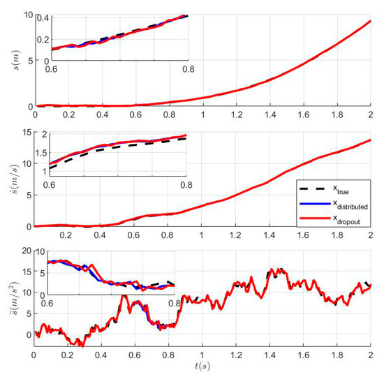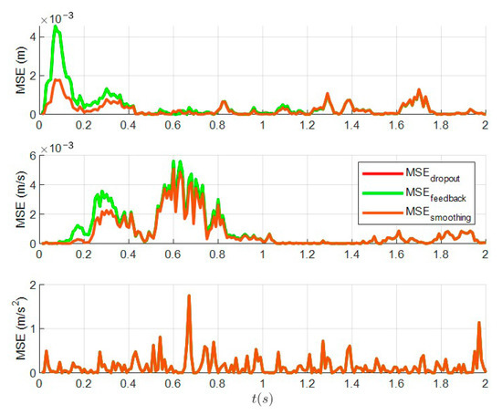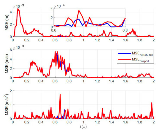 Dropout during transmission is inevitable due to the performance differences of different sensors and external interference. Thus, it is assumed that dropout exists at t = 0.6–0.8 s and is compensated by the predicted value of the previous moment. Figure 1 shows a comparison of the tracking effect between distributed Kalman filtering and distributed Kalman filtering with dropout, and Figure 2 shows the MSE of distributed Kalman filtering and distributed Kalman filtering with dropout. The presence of dropout at 0.6–0.8 s in Figure 2 is clearly indicated.