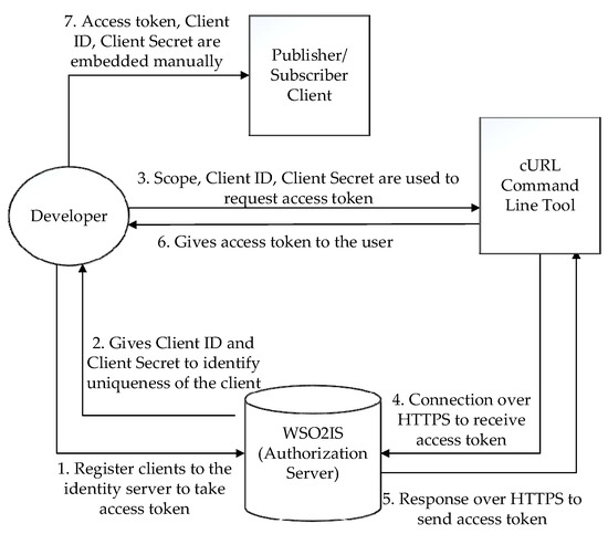 Initially, a developer manually registers all clients to the WSO2 identity server (WSO2IS) [55]. This procedure is carried out to implement an authorization layer via OAuth 2.0 and to get a unique access token. Remarkably, making that manually may not be the most practical way in some “crowded” scenarios, but certainly, it is the most secure way to do it (without using TLS). WSO2IS creates a client-side secret and the client ID information to obtain an access token. Therefore, the client can achieve unique credentials with an ID and a secret. In order to request an access token for any client, the developer must submit the scope, client ID, and secret information parameters to the WSO2IS via the cURL tool. The registration step is shown in Figure 1 to explain how to access the token in OAuth 2.0 applications. The “developer” in Figure 1 is a responsible person, such as a network owner or an administrator. Flows 2, 4, 5, and 6 are secured through HTTPS.