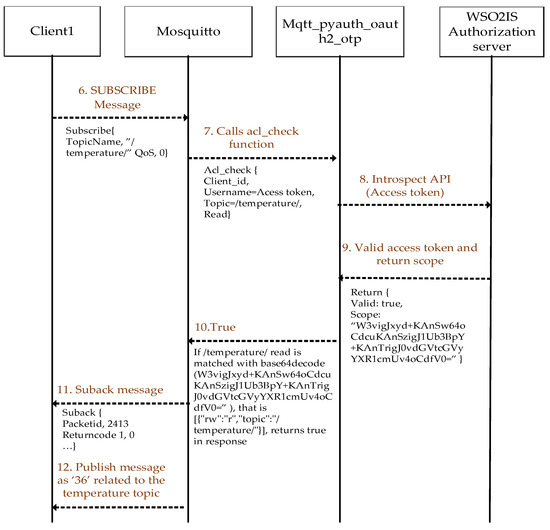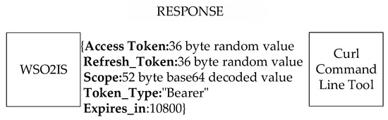 The scope is defined in JSON format for clients as in the example: {“rw”,:“rw”,“Topic”:“\temperature\”}. This means that the client is a publisher who claims both read and write permissions to transmit and receive the “temperature” data to or from the broker. Its base64-encoded version is written as the scope to request an access token from WSO2IS apart from the devices’ client ID and client secret. Our online supplement provides the resulting command (see row 1 of Supplementary Table S2 at srg.cs.deu.edu.tr/publications/2023/maras/—accessed on 2 May 2023).