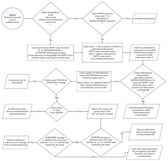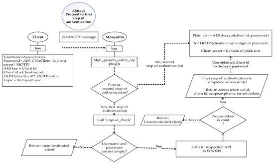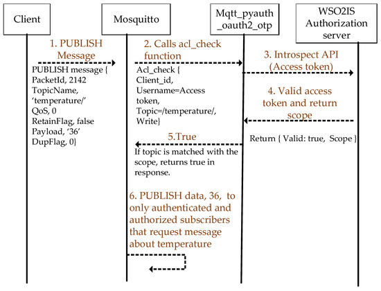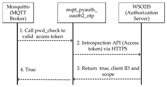 The first authentication step takes place by the OAuth 2.0 authorization protocol, and how it is performed is sketched in Figure 4. When an MQTT CONNECT message arrives in the Mosquitto broker, the authentication is performed on WSO2IS by verifying the access token (username). Mosquitto_pyauth [56], a third-party code published on GitHub by Marcin Bahry, provides a Python-based backbone for the Mosquitto broker software. Through personal communication, his code is further developed to extend its functionality to match our security mechanism. Our efforts yielded a novel plugin called MQTT-pyoauth2.0_otp, which runs over Mosquitto to implement the security mechanism. The “pwd_check” function of the MQTT-pyoauth2.0_otp plugin is called to validate the access token among the existing records of WSO2IS. If successful, the client is authenticated by the Mosquitto broker that it is connected to. The MQTT-pyoauth2.0_otp plugin calls the introspection application program interface (API) to verify the access token from the authorization server via the HTTPS protocol. If the client is not registered to the WSO2IS before (or removed), the access token authentication will naturally fail, and the response of the message will indicate that it is an inactive token.