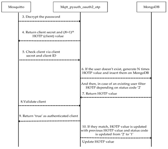 After the verification of the access token, dynamic passwords should be generated. To maintain that feature, a MongoDB database has been implemented as the backend record-keeping facility in the Mosquitto broker. Dynamic passwords are basically HOTP values that are used to prevent replay attacks. The relevant procedure and its steps are shown in Figure 5. Thanks to the HOTP, a previously issued password shall be invalid after each connection. Thus, a prior connection will be rejected when an attacker has eavesdropped on one password and attempted to connect repeatedly. In addition to this, mutual authentication between a client and a broker is performed by comparing HOTP values. MQTT-pyoauth2.0_otp should generate the HOTP values N times to implement the second authentication step. To proceed, the password is deciphered by Mosquitto using the AES secret key (the client ID) when the active access token is received in the response of the WSO2IS. Thus, the client ID is acquired by the Mosquitto broker. So, as shown earlier in Figure 3, the client ID can securely be known to the Mosquitto broker without sending it from the client to the broker over an insecure channel. This is a crucial functionality. In this way, listening (sniffing) to the client ID or guessing the password and accessing the system by imitating another client is prevented. The diagram of the procedure is given in Figure 5.