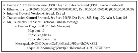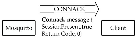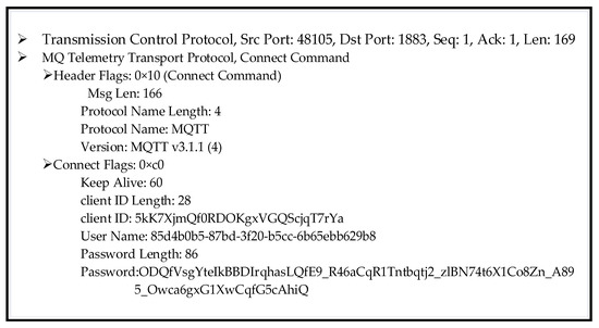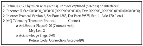 After completing the authentication steps, Mosquitto sends a CONNACK message to the client. That CONNACK message includes return codes ‘0’ to ‘5’. When the client is authenticated successfully, the return code ‘0’ is given in the response message, implying that the connection request is accepted. The remaining codes, namely, ‘1’, ‘2’, ‘3’, ‘4’, and ‘5’, all mean that the connection is rejected, so the connection fails. Two of them, ‘2’ and ‘5’, are directly related to authentication failure. In the CONNACK message, in the case of return code ‘2’, a “bad name or password” is returned as the reply, while in the case of code ‘5’, “unauthorized” is returned as the reply. An example CONNACK message with return code ‘0’ in our implementation is shown in Figure 6.