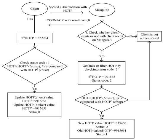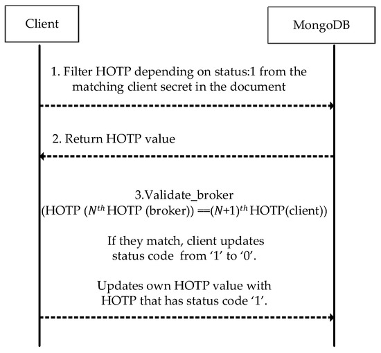 HOTP values with the status code ‘2’ indicate an initiated authentication procedure for the broker and the client. If the status code of a HOTP value that is associated with an existing client secret on MongoDB is ‘2’, the JSON document is updated after the validation of the client so that the status code of the (𝑁 − 1)th HOTP value is changed to ‘2’ from its original value, namely, ‘0’.