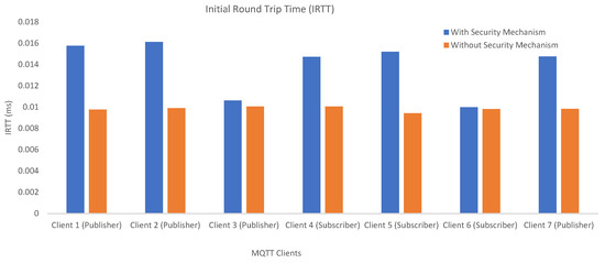 Table 8 compares communication costs in terms of sent bits in a scenario where there is one publisher client, one subscriber client, and one broker so that a publisher seeks authorization to send some data to the subscriber over the broker. With MARAS, a client sends a broker 28 bytes of client ID + 36 bytes of token (i.e., username) + 86 bytes of password, which sum up to 150 bytes (1200 bits). A broker sends the authentication server data totaling 334 bytes (2672 bits) over TLS; later, it sends an ack to the client totaling 2 bytes (16 bits). While refs. [39,40]’s costs are equivalent, communication with MARAS costs less than both when a public channel is used and more than both when a TLS channel is used.