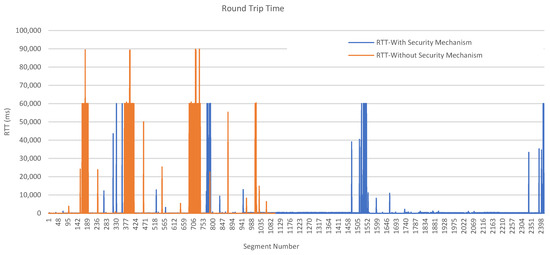 From Figure 16 and Table 10, in a long-lasting sensor network scenario where the number of data packages to be disseminated to the network is larger than 1000, the PUBLISH messages will most likely dominate the network’s traffic because the other messages are only sent once (or occasionally). Yet, 1000 is a very modest number for many scenarios as a sensor network may cast millions of messages in its entire lifetime. Therefore, although the cost increase is larger in CONNECT messages, the main cost comes from securing the published data. Hence, MARAS shall double the total traffic overhead compared to the non-secure case. However, assuming there is no multimedia content, the message sizes are still tiny. So, this overhead may be tolerable in most cases if the security of the network is a major concern. Yet, our repeated tests showed that round trip times for a CONNECT message (and its “ack” counterpart) are only delayed by less than a percentile of a millisecond. For a PUBLISH message, the delays again depend on the size and frequency of the published information, but we can safely say that the delay is upper bounded by 163% of the network defaults. Moreover, (from Figure 18), the upper bound of the RTT of a segment (consisting of 1000 PUBLISH messages) does not increase with MARAS. So, the scheme’s degrading effects on the system performance are limited and tolerable.
