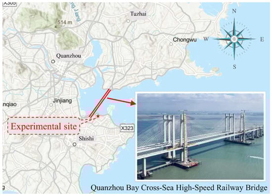 The experimental cable segment is taken from a long-span cross-sea cable-stayed bridge in China, named “the Quanzhou Bay Cross-Sea High-Speed Railway Bridge (QBCB)”, which is located at the longitude 118°42′ east and the latitude 24°50′ north. The bridge spans over Quanzhou Bay in the south–north direction and connects to Quanzhou City along the same direction. As shown in Figure 1, the main bridge is a double-tower, double-plane cable-stayed bridge with a main span of 400 m. The span layout is 70 m + 130 m + 400 m + 130 m + 70 m, totaling 800 m. The inclination angle between the longitudinal axis of the main girder and the north direction is 38°. The towers are H-shaped concrete towers with a height of 160.254 m. There are 18 cables on each side of the bridge tower, and the angle between the cables and the tower changes from 61° on the innermost side to 13° on the outermost side. The stayed cable adopts a spatial double-plane system with a fan-shaped arrangement and the cable spacing on the main girder is 10.5 m. The longest cable is about 218.2 m, and the main specifications are PES(C)7-211 and PES(C)7-151. The cables are composed of parallel 7 mm-diameter steel wire bundles with a strength of 1670 MPa, and the outer sheath is made of high-density polyethylene (HDPE).