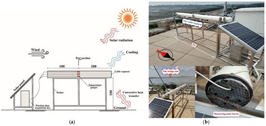 Relevant thermal phenomena of cables include heat conduction, solar radiation, and convective heat transfer (cooling). The heat transfer in the cable is mainly heat conduction. The form of heat transfer between the cable and the environment can be divided into solar radiation and convective heat transfer. For example, the wind speed in the environment affects the convective heat transfer between the cable and the air and the solar radiation mainly comes from the sun. The heat transfer and the temperature test scheme on the cable segment are illustrated in Figure 2a.
