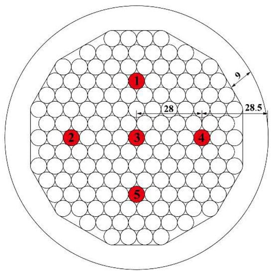 The temperature sensors are arranged in the test section and divided into two groups. One group has one temperature sensor positioned in the center, which is 56.5 mm away from the outer edge of the cable. Another group has four temperature sensors positioned on the outer layer, which is 28.5 mm away from the outer edge. The cable is composed of parallel steel wires with a diameter of 7 mm, and it is covered by an outer HDPE sheath with a thickness of 9 mm. The locations of all temperature sensors are shown in Figure 3.