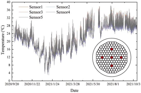 The analysis of the data collected at each temperature measurement point shows that the amplitude of the temperature variation at each point is basically consistent. The measured point temperatures exhibit obvious seasonal variation characteristics in sine-curve form. Since the cable is a small member with excellent heat transfer performance [34], the temperature gradient within the cable cross-section is negligible. This is shown through an analysis of the experimental data.