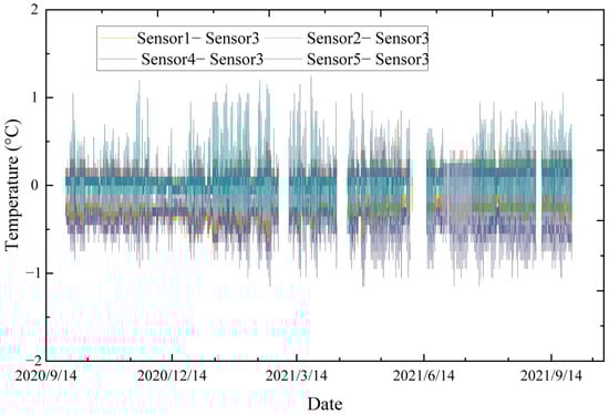 To study the temperature distribution pattern of the cable, the cable cross-section is divided into inner and outer layers according to the location of the temperature sensors installed in the test. If there is no cross-sectional temperature gradient in the cable, the temperature of the inner layer measuring point (Sensor 3) should be consistent with that of the outer layer measuring point. Therefore, the temperature of Sensor 3 is used as the benchmark value, and Sensor 3′s temperature is subtracted from the temperatures of the other four measuring points to compare the temperature differences. The results are shown in Figure 5.