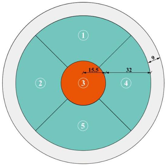 where Ti is the temperature of sensor, i; Ai is the area surrounding sensor, i; and A is the cross-sectional area of the cable. The cross-section is divided into five parts according to the arrangement of measuring points, as shown in Figure 7.