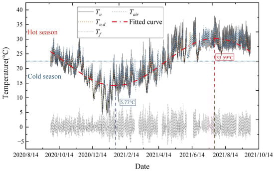 Table 1 shows that the highest Tf occurs between 13:00 and 15:00 hours, covering 70.49% of all hot season data, and that the lowest Tf occurs between 5:30 and 7:00 hours, covering 65.57% of all hot season data. Similar conclusions can be drawn for the cold season. Therefore, based on the statistical results, the minimum fluctuating temperature appears at a more scattered time, while the maximum fluctuating temperature appears at a more concentrated time. In general, the lowest Tf occurs at the time of 5:30–7:30; the highest Tf occurs at the time of 13:00–15:00.