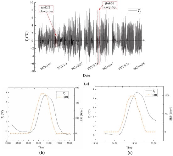Time history of the fluctuating temperatures, Tf, of the cable. (a) Time history of the daily fluctuation Tf; (b) Tf and SRI on 2 December 2020 (a cloudy day); (c) Tf and SRI on 30 April 2021 (a sunny day).