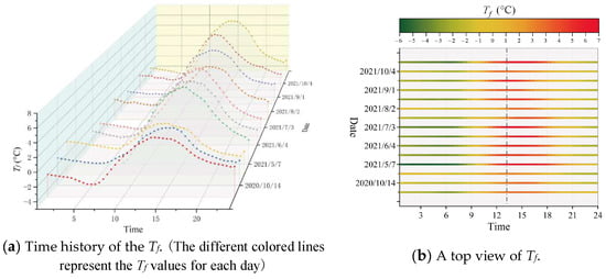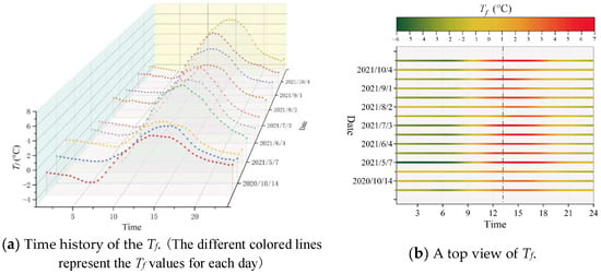 The measured Tf values of several typical sunny days in the hot season are selected as examples for demonstration. The Tf data of typical sunny days are listed separately by the day cycle, as depicted in Figure 10a. As seen, the trend of Tf values on different days essentially stays the same and the only difference is the changing amplitude. A top view of Figure 10a is shown in Figure 10b. During the sunny days of a hot season, it is visible that Tf has the highest amplitude during the time of 13:00–15:00 and the lowest amplitude during the time of 5:30–7:00.