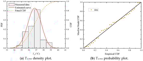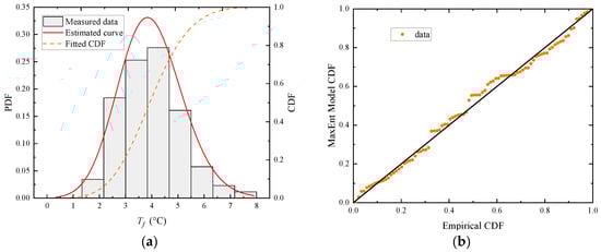 Taking the hot season as an example, as seen in Figure 10b, the maximum variation amplitude of Tf occurs around the hour of 13:00. Thus, the sample group can be formed by taking the Tf at 13:00 hour on sunny days during the hot season. The ManEnt extreme value model is used to statistically analyze this sample group and the histogram of the 13:00-hour sample group, and the fitted probability density function (PDF) and cumulative probability function (CDF) are obtained and plotted, as shown in Figure 12a. The density distribution plot is consistent with the histogram of the data. Furthermore, the probability-probability (P-P) plot technique, which plots the empirical CDF against the theoretical CDF, is employed to better illustrate the fitness of the MaxEnt extreme value model, as shown in Figure 12b.