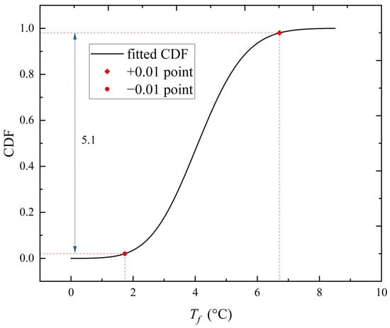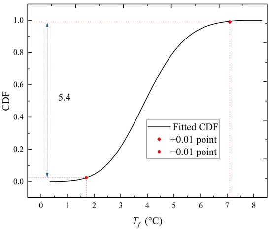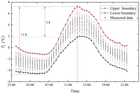 With an exceedance probability of 0.01, the same fluctuation temperature envelope curve can be concluded from the Tf data collected during the cold season. The sample group can be formed in the same way as the previous calculation by taking the Tf at 13:00 hour on sunny days during the cold season. The MaxEnt extreme value model is used to statistically analyze this sample group; the histogram of the 13:00 sample group and the fitted PDF and CDF are obtained and plotted in Figure 15a. The density distribution plot is consistent with the histogram of the data. Then, the information represented by the P-P plot indicates a good fit, as shown in Figure 15b. The points in the P-P plot approximately lie on the 45° comparison line from (0,0) to (1,1). As noted, the MaxEnt model fits satisfactorily with the 13:00-hour sample group. Then, the CDF of the 13:00-hour sample group is obtained, as shown in Figure 16. The probability that Tf exceeds the extreme value by +0.01 point is 0.01, and the probability that it is lower than the extreme value by −0.01 point is also 0.01. These two points are taken as the representative values of Tf at 13:00 hour. The remaining 47 sample groups, aside from the 13:00-hour group, are subjected to the same extreme value analysis procedure, and the MaxEnt model produces a comparable level of fit goodness. The representative Tf values at each moment are connected with a line to form the upper and lower boundaries of the daily cycle variation, whereas the scattered points represent the sample of collected Tf values for all sunny days during the cold season, as shown in Figure 17. During the cold season, Tf is lowest around 6:30 hour and highest around 15:00 hour, and the amplitude of the upper and lower bounds is 15.3 °C. Under the condition of exceeding probability = 0.01, the range of Tf variation is −6.22~9.15 °C.