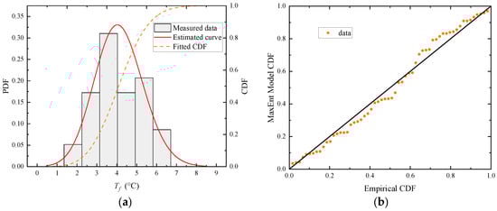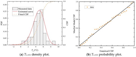 Similar to the previous example, the MaxEnt model is also applied to construct the distribution of the annual minimum uniform temperatures (Tu,min). The fitted PDF is consistent with the histogram of the data, as shown in Figure 25a. Furthermore, the set of plotted points is nearly linear, as shown in Figure 25b, which validates the fitted model.