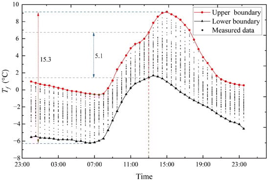 According to the Chinese specification [27], for bridge thermal action with an exceedance probability of 0.01, the probability, p, of Tf exceeding the extreme value, can be set as 0.01 (equivalent to a mean return period of 100 days). To obtain a representative daily fluctuating temperature, Tf, at each moment, the collected Tf at a certain moment of the day in the hot season (or cold season) can be taken to constitute the sample set. After fitting the data with the maximum entropy extreme value model, the representative Tf values for each time are determined. After that, a fluctuation temperature envelope curve with an exceedance probability of 0.01 is generated using the representative Tf values at each moment.