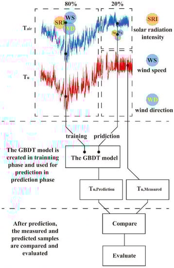 - This study establishes the use of the GBRT model to predict Tu in the cable considering four environmental variables (air temperature, solar radiation intensity, wind speed, and wind direction) at the bridge site. As for Tu prediction, the prediction accuracy of the GBRT model is significantly higher than that of the univariate linear regression (ULR) model that considers a single environmental factor only.